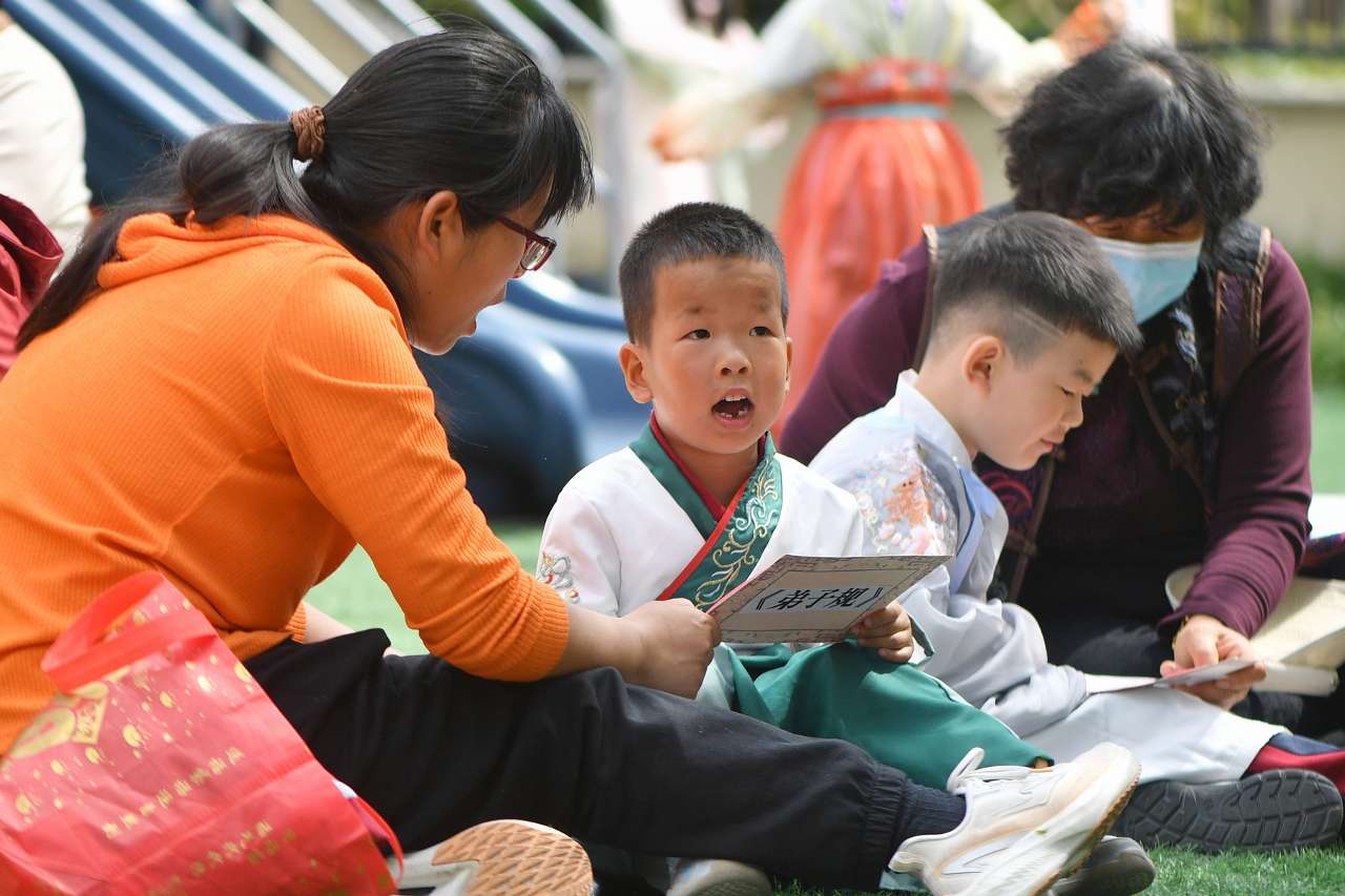4月16日,山东省青岛市城阳区夏庄街道玫瑰园幼儿园开展春日阅读节主题活动,小朋友在背诵弟子规。