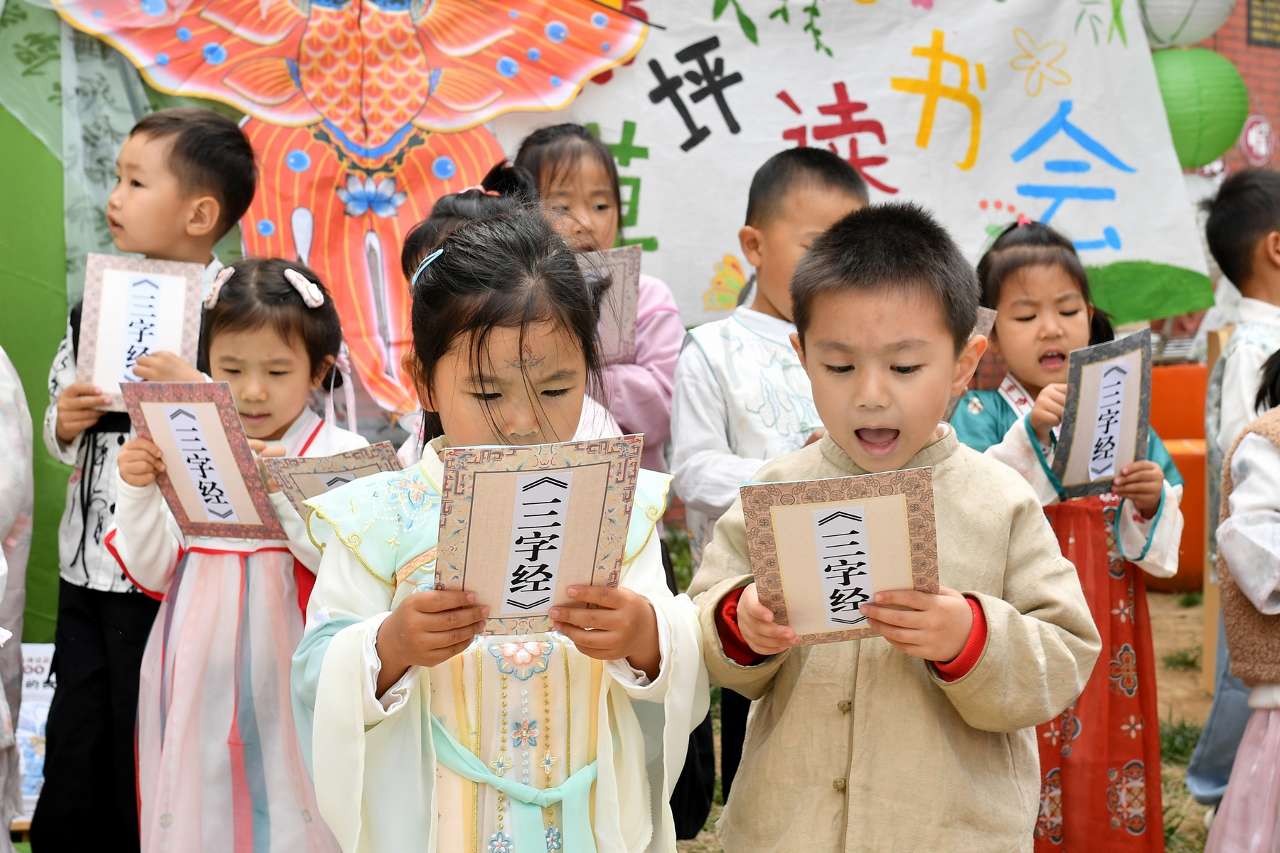 4月16日,山东省青岛市城阳区夏庄街道玫瑰园幼儿园开展春日阅读节主题活动,小朋友们在朗诵《三字经》。